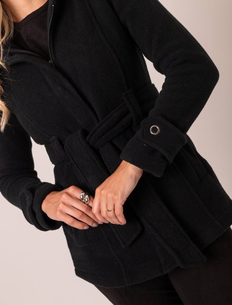 Casaco em tecido Soft, modelo estilo blazer com gola e faixa na cintura, bolsos funcionais e fechamento de zíper e faixa na cintura.